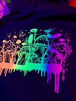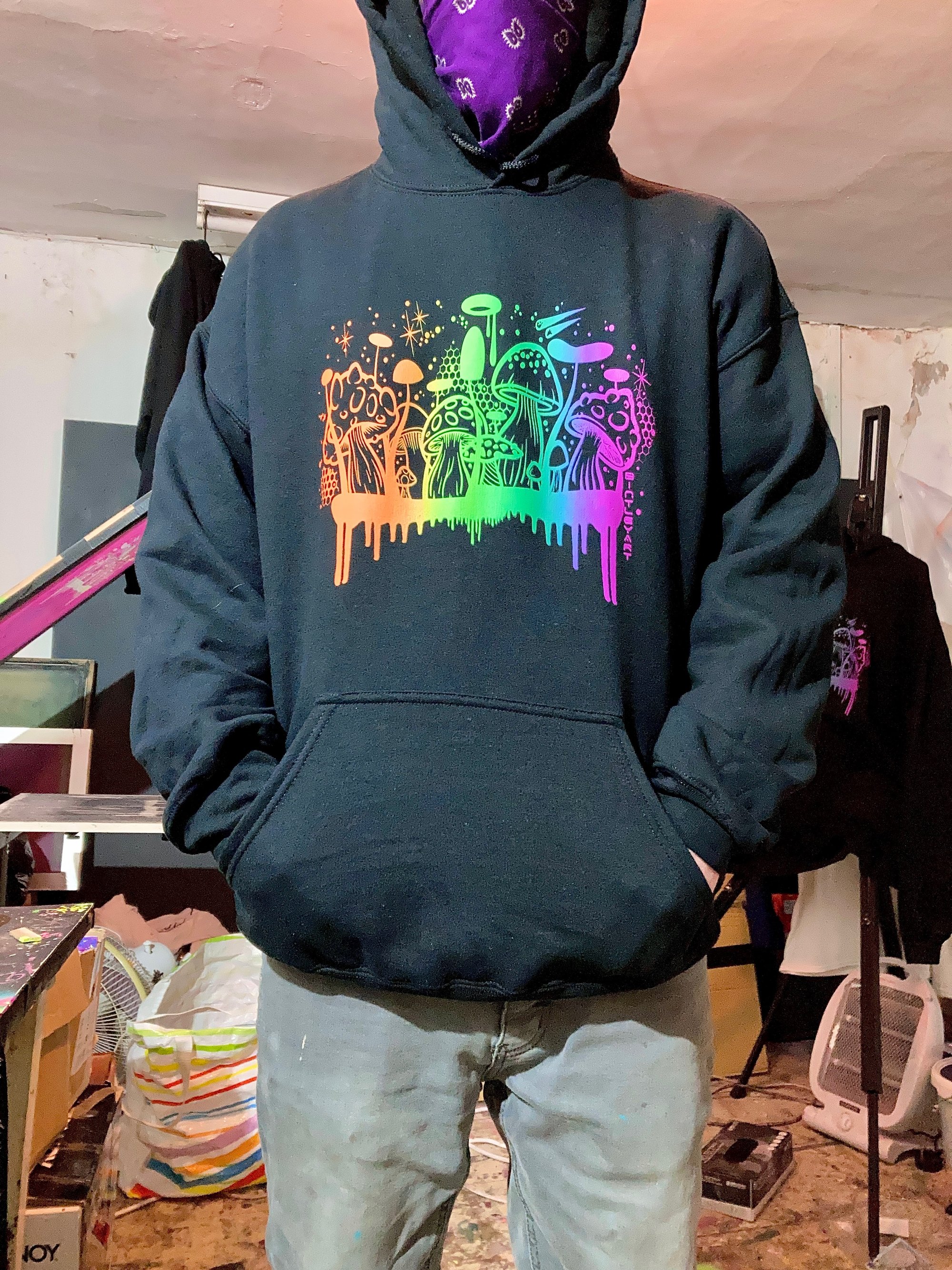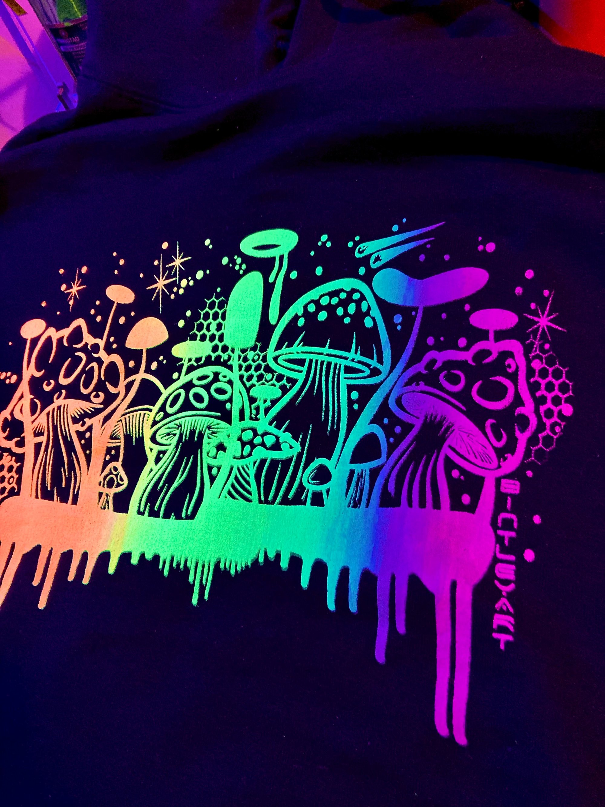 Fluorescent UV/blacklight reactive hoodies featuring a handpulled split fountain neon screenprinted front design onto black Gildan heavy blend hoodies.